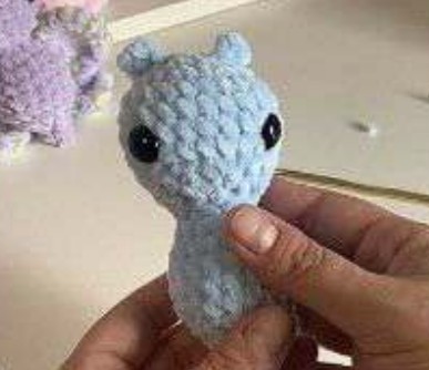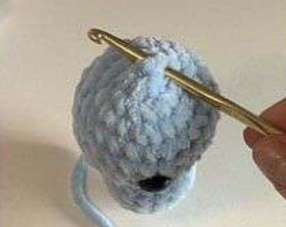 Inserire gli occhi di sicurezza tra i giri 6-7, con 5 maglie visibili tra loro. Iniziare a imbottire e continuare a imbottire.
