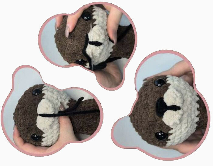 Posizionare il muso tra gli occhi, coprendo i giri 9-10. Cucire uniformemente tutto intorno al bordo, assicurandosi che sia centrato e ben piatto.