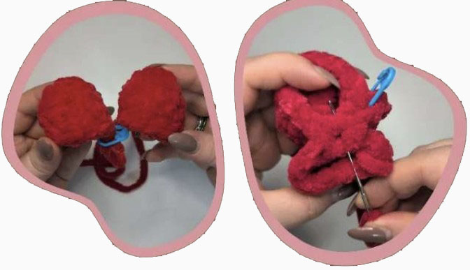 Prima di cucire le braccia, assicurarsi che la coda di filo dell’anello magico sia tirata verso l’esterno, poiché sarà usata successivamente per fissare il cuore. Cucire le braccia verticalmente tra i giri 21-24. Assicurarsi che siano equidistanti su entrambi i lati del corpo.