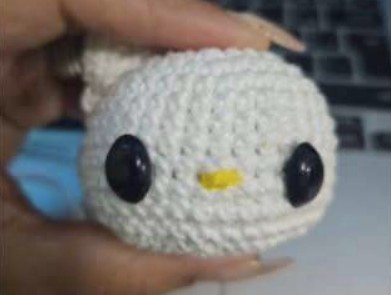 Con un pezzo di filo canarino, ricamare il naso tra i giri 10 e 11, prendendo 2maglia (dall’aumento) tra gli occhi.