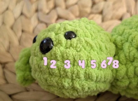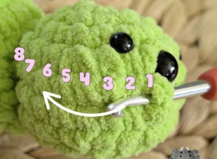 Guardando l’immagine qui sotto, attacca il filo alla Maglia 1 (R5, una maglia a sinistra dall’occhio). Assicurati di avere 8 maglie dall’attacco del filo fino alla parte posteriore della testa.