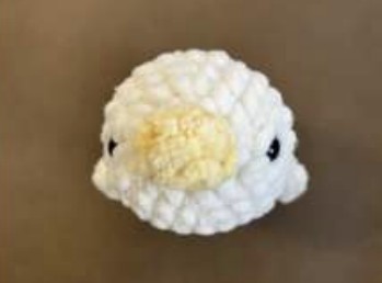 Il corpo e la testa dell’amigurumi possono essere imbottiti a piacere, ma le gambe della piccola anatra dovranno essere lasciate vuote. Gli occhi dell’anatra devono essere realizzati utilizzando occhi di sicurezza. Inoltre, se lo desiderate, potete dipingere le guance del giocattolo di rosa, come mostrato nella foto.