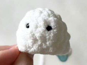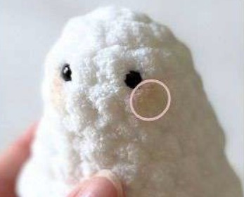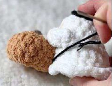 Per entrambe le braccia, cucire a 2-3 maglie di distanza da dove sono stati posizionati gli occhi – assicurarsi che le braccia siano allineate con il centro del viso e cucire sopra le “mani/polsi” per mantenerle in posizione.